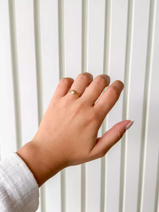 Seu design combina o brilho elegante do dourado com o detalhe central do olho, que recebe uma zircônia delicada para trazer luminosidade e valorizar ainda mais o visual da peça. O aro fino e moderno deixa o anel leve e confortável, enquanto os detalhes em volta do olho garantem personalidade e sofisticação. É uma peça que se destaca pela sutileza, mas que ao mesmo tempo não passa despercebida.
