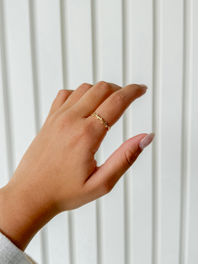 Um toque de textura, leveza e elegância para acompanhar você todos os dias. O Anel Olivia Dourado traz um design minimalista com personalidade, marcado por pequenas esferas alinhadas ao longo de toda a haste. Essa composição cria um efeito visual moderno e delicado, perfeito para quem valoriza peças discretas, mas cheias de charme.
