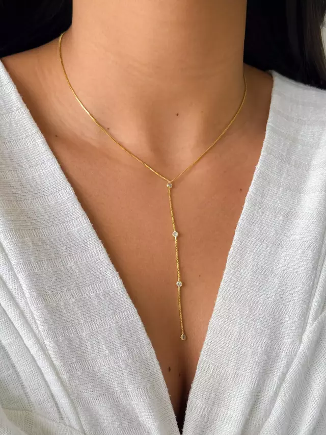 O formato gravata é conhecido por alongar e afinar visualmente a silhueta, destacando a região do colo com leveza e elegância. No Colar Gravata Ponto de Luz Dourado, essa característica se torna ainda mais marcante graças ao contraste entre o banho dourado e o brilho translúcido das zircônias. O resultado é uma peça moderna e sofisticada, que transita com facilidade entre produções básicas e looks mais elaborados.