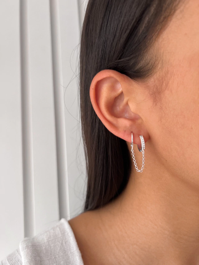 A Dupla Cravejada Prata é a peça perfeita para quem busca sofisticação e um toque de modernidade. Com duas argolas delicadas, sendo uma cravejada e uma lisa unidas por uma corrente, esses brincos criam um visual sofisticado e cheio de estilo. O design contemporâneo, aliado ao brilho discreto das pedras, torna essa peça ideal para complementar tanto looks casuais quanto mais elaborados.