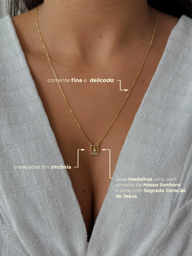 Use como amuleto de proteção e fé, mantendo as imagens junto ao corpo ou como parte visível do look. Ele pode ser usado sozinho para um visual discreto e simbólico ou combinado com colares mais curtos, criando uma composição moderna com significado especial.