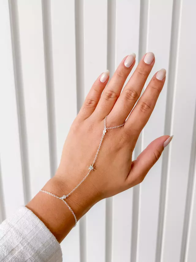 Esse modelo de hand chain tem se tornado cada vez mais popular entre mulheres que gostam de acessórios exclusivos e atuais. Diferente das pulseiras tradicionais, ela cria um efeito visual único, destacando-se pela forma como acompanha naturalmente o movimento das mãos. A estrela central funciona como protagonista do design, enquanto os pontos de luz acrescentam luminosidade extra, garantindo um acabamento moderno e delicado.