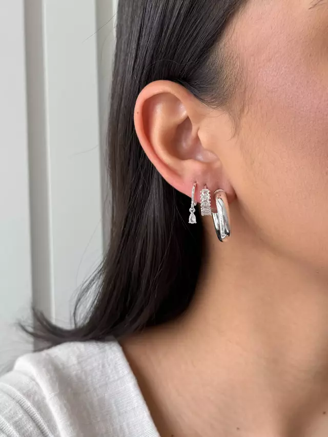 Fechando o trio, a Dupla Gota Cristal traz o charme final. Com pedras delicadamente lapidadas e design pendente, ela adiciona movimento e leveza, destacando o brilho da prata e criando um visual harmonioso e sofisticado.