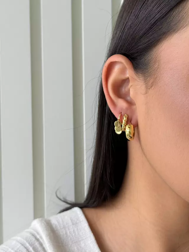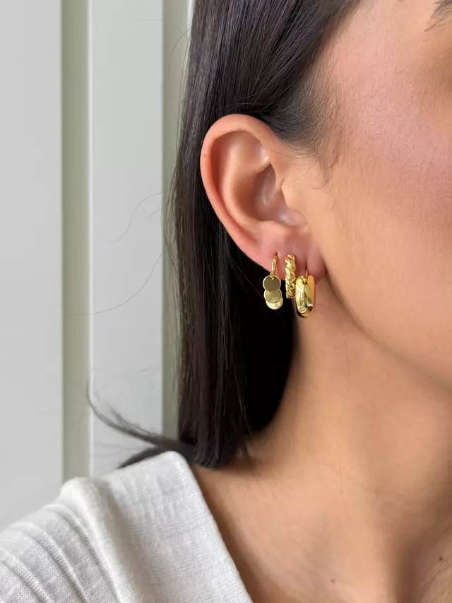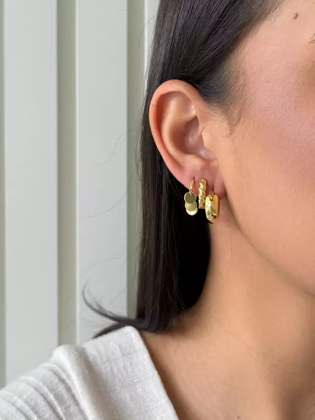 Design: combinação de argola lisa, argola com textura croissant e argola com três medalhas pendentes.
