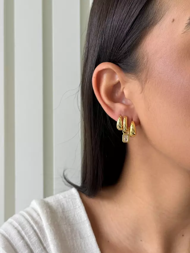 A Argola Lisa G é a peça de destaque do mix. Com design volumoso e acabamento espelhado, ela reflete a luz com intensidade e adiciona um toque imponente ao visual. Já a Argola Eva equilibra o conjunto com o brilho delicado do seu pingente retangular cravejado em zircônia, trazendo leveza e sofisticação. Por fim, a Argola Lisa M completa o trio com seu formato compacto e elegante, criando um jogo de proporções que valoriza o rosto e deixa o mix ainda mais interessante.
