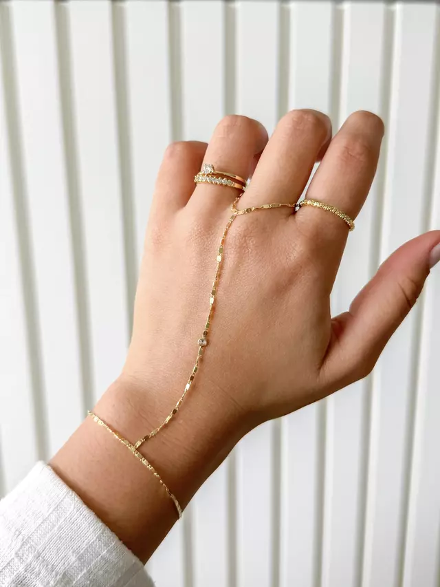 Design: anéis reguláveis e hand chain com pontos de luz delicados e acabamento polido.