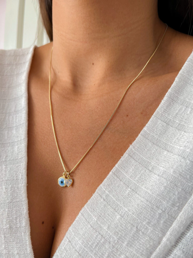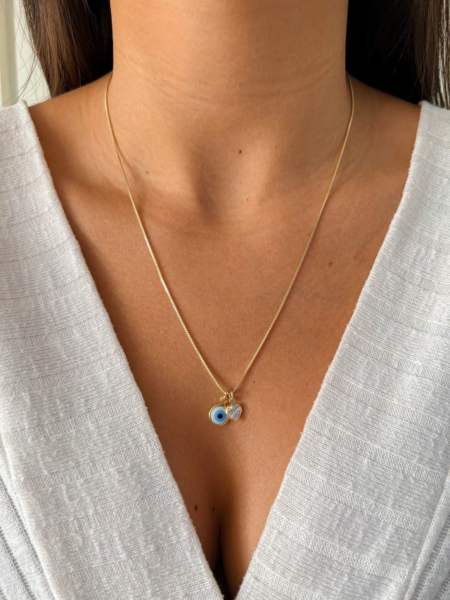 Design: Pingente de olho grego delicado, com acabamento dourado refinado, trazendo um toque de sofisticação e proteção.