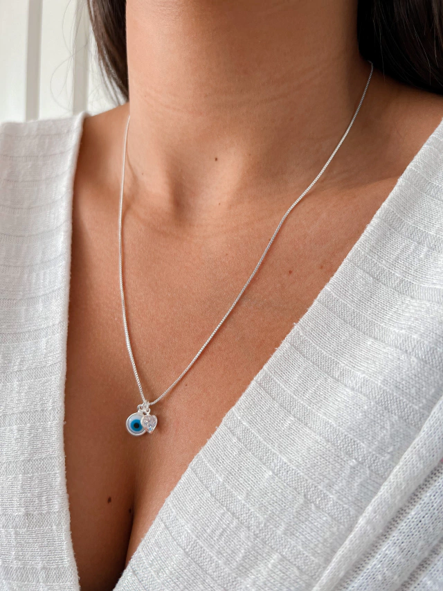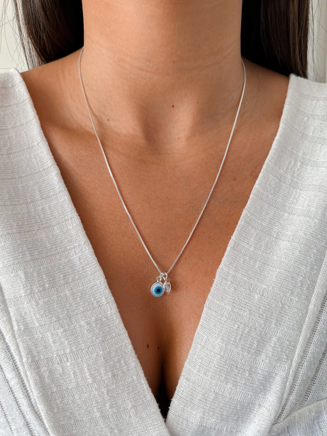 Design: Pingente de olho grego, com um formato clássico e delicado, enredado com uma corrente fina de elinhos que complementa o visual sofisticado.