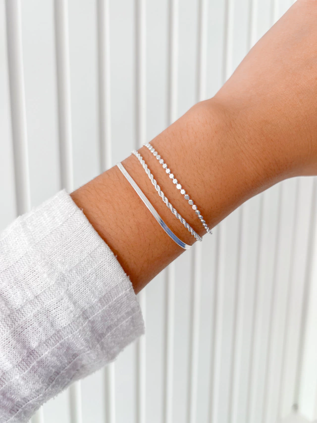 A Pulseira Chapinhas Prata é uma peça leve, moderna e cheia de movimento. As pequenas chapinhas lisas e alinhadas ao longo da corrente criam um efeito visual marcante, refletindo a luz com delicadeza a cada gesto. É o tipo de acessório que adiciona um toque de brilho ao visual de forma discreta, mas com presença.
