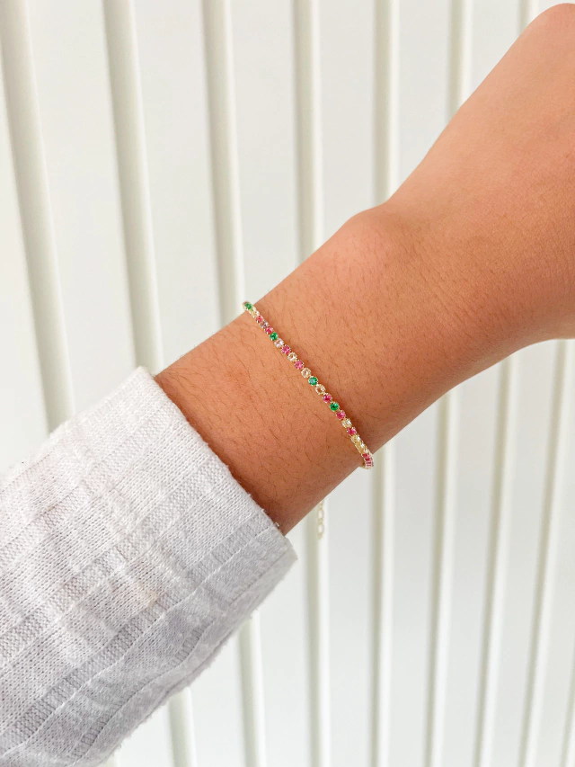 Design: estilo riviera com zircônias coloridas aplicadas em ordem aleatória — cada pulseira é única.