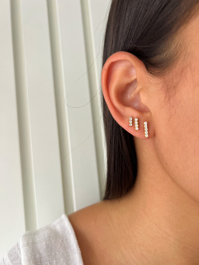 Design: Três brincos retangulares cravejados com pedras de zircônia, criando um visual sofisticado e moderno.